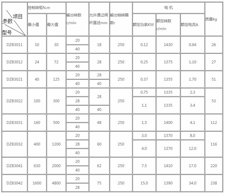四、DZB系列阀门电动装置主要技术性能参数表